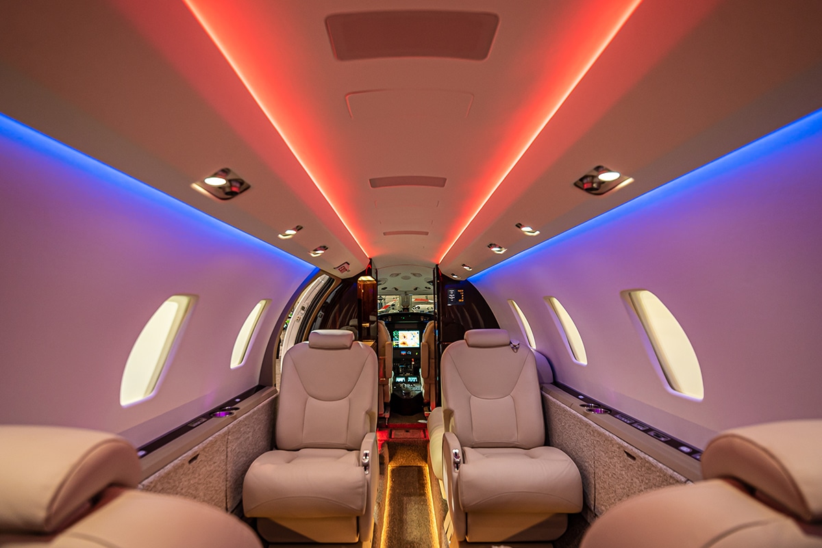 Cessna built 374 of the original model of Citation Excel between 1996 and 2004, at which time it introduced the upgraded Citation XLS. While the original Citation Excel came standard with the Honeywell Primus 1000 three-screen EFIS avionics package (two Primary Flight Displays, one for each pilot, and a multifunction display), the new version sported a modern “glass cockpit” avionics package. This upgrade traded the traditional analog gauge-and-dial instrument panel for the Honeywell Primus 1000 EFIS avionics suite, including all-digital flight instrument displays. In addition to an improved avionics package, the Citation XLS also got a performance boost, trading up the original engines for a pair of Pratt & Whitney Canada PW-545B turbofans. These allow a normal cruise speed of 422 knots, a range of 1,989 nautical miles, and a climb rate of 3,500 feet per minute (while burning ten fewer gallons of fuel per hour than the Citation Excel). It requires 3,812 feet of runway to takeoff and 3,619 to land. Cessna produced 330  Citation XLS model aircraft before switching production to the Citation XLS+ edition.[6] The Citation XLS+ features full authority digital engine/electronics controls (FADEC), even more powerful and efficient PW545C engines, and a completely revised nose design reminiscent of the Citation Sovereign and Citation X configurations. Citation XLS+ models also feature Collins Pro Line 21 Avionics and a four-screen LCD EFIS display (upgraded from the three-screen LCD configuration of the XLS). These allow the flight crew to enter flight data such as wind conditions, runway length, and cruise altitude into the flight management system (FMS) to optimize the aircraft’s performance and handling. These extraordinary advances in technology and avionics make the aircraft even more fuel-efficient, increase safety, and improve the pilot’s overall flying experience. The new Citation XLS+ design also again increased the power and efficiency of the engines, outfitting the craft with two Pratt & Whitney Canada PW545C series engines. Its maximum cruise speed is 441 knots, with a range of 2,100 nautical miles and a climb rate of 3,500 feet per minute. The XLS+ requires approximately 3,560 feet of runway to takeoff and 3,619 to land.[7] The XLS+ remains in production. Each of the 560XL series model upgrades focused mainly on increasing power, improving efficiency, and upgrading the craft’s avionics technology rather than making cosmetic changes. The popular cabin design is essentially the same on all three models, although the classic styling can now be augmented with available modern conveniences like WiFi. Seating and storage configurations can accommodate up to a maximum of 12 passengers and 800 pounds/90 cubic feet of baggage. Luxurious cabin retrofits can customize the space to your personal style and business needs, with a wide variety of top-quality finishes, fabrics, lighting, sound, and entertainment packages to choose from.