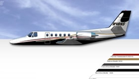 Eight Place Interior With Forward Left Hand Galley, Opposite Aft Facing Single Seat, Four Place Aft Club, Two Forward Facing Single Seats, Belted Lav. All Seats in Stone Leather. Figured Walnut Wood Veneer.