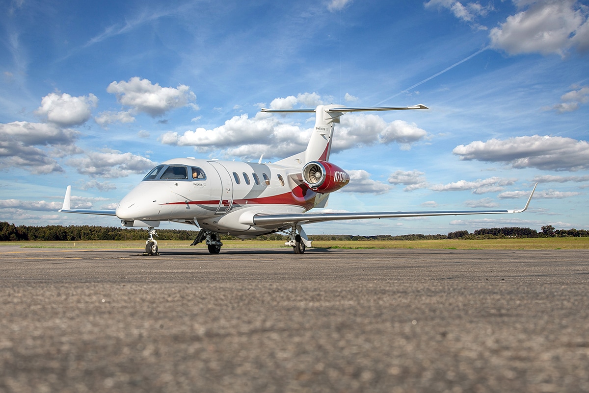 Seven-passenger executive interior with center club arrangement including dual executive tables. The forward cabin offers a refreshment center and a RH rear-facing seat. The aft cabin includes two forward-facing seats and a lavatory that has a belted lav seat and sink. Leather seating, natural wood veneer with high gloss finishing throughout.